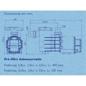 Motobomba Centrífuga com pré-filtro 3/4cv - 220v - AUTOESCORVANTE Para circulação da água em sistemas de filtragem de piscinas e spas. Para circulação da água em sistemas de aquecimento solar. Super Silenciosa Resistente à submersão temporária Em água Proteção IP67 Não corrosível Alta Vazão Com sensor de carga 2 ano de Super Silenciosa adiciona menos de 5dB em relação ao ruído ambiente. Não necessita ventilação externa troca de calor por ciclo fechado com a água, com aproveitamento total da energia elétrica . Motobomba centrífuga mono estágio operação contínua . Motor monofásico de capacitor permanente Monovolt 120V ou 220V - 60 Hz. Selada com proteção IP67 NBR6146 Totalmente protegida contra poeira e resistente a submersão temporária em água. Proteção térmica com termostato bimetálico Desliga automaticamente a motobomba na ocorrência de sobreaquecimento. Sensor de carga: A motobomba Syllent é fornecida com dispositivo eletrônico de segurança, o qual desliga automaticamente após 12 segundos aproximadamente nos casos de ausência de água ou Sobreaquecimento e após 5 segundos nos casos de bloqueio do rotor. Nestas ocorrências, para reiniciar o funcionamento é necessário desconectar a motobomba da rede elétrica rearme manual . Isolada eletricamente e não oxidante Nenhum contato da água com eletricidade e componentes metálicos. Rotor/turbina/mancais hidro magnéticos conjugados. Estator bobinado encapsulado em resina. Isenta de mancais de rolamentos e vedações dinâmicas do tipo selo mecânico. Chicote elétrico com cabo terra interno. Tubulação de recalque: União 50mm soldável Tubulação de sucção: União 50mm soldável Temperatura de operação da água: 5C a 45C Temperatura ambiente local onde a motobomba está situada : 5C a 45C. Trabalhamos também com Filtros e Bombas para Hidromassagem Syllent. TFL Automação Marca: Não Informado