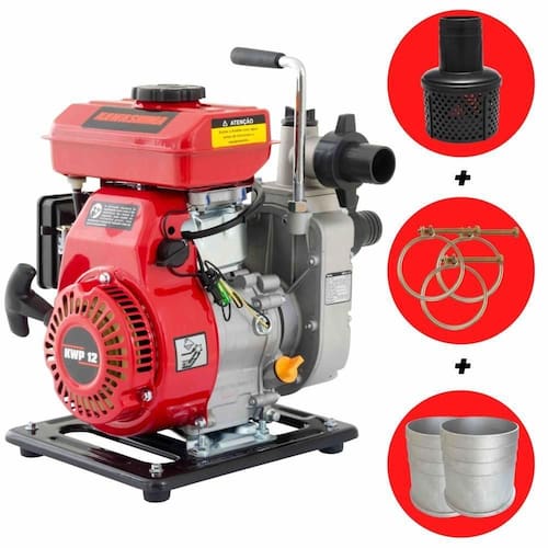 Motobomba Kawashima KWP-12 é equipada com motor a gasolina de 4 tempos de 97,7cc e possui diâmetros de sucção/saída de 1,1/2"(40mm), com altura de envio de 20m, vazão maxima de 14 m/h, com partida manual. ;A Motobomba é portátil, econômica e fácil de operar. Indicada para o uso agrícola e urbano, ideal para a transferência de água limpa para abastecimento de caixas de água, cisternas, etc. ;