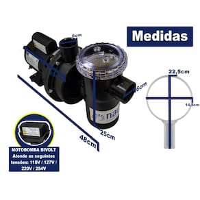 tamanho: -altura cm : 25cm -comprimento cm : 48cm -peso: 8,9kg volume m : 0,032 modelo: nbfc tensão: 110/220v - é um produto bivolt fase: monofásica cv: 1/3 potência nominal kw : 0,25 diâmetro de sucção e recalque: -interno: 50 mm 1. 1/2 -externo: 60 mm 2 -piscinas até: 40. 000l