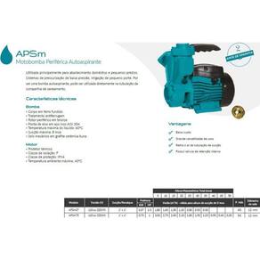 Utilizada principalmente para abastecimento doméstico e pequenos prédios. Sistemas de pressurização de baixa pressão. Irrigação de pequeno porte. Por ser uma bomba autoaspirante, pode ser utilizada diretamente na tubulação da companhia de saneamento. Grande versatilidade de usos, retira o ar da tubulação de sucção e possui válvula de retenção interna. Cor: Verde e preto. Modelo: APSM75L Tipo: Periférica autoaspirante. Potência: 1.0 Hp. Voltagem: 220V (monofásica). Características da bomba: Material: Ferro fundido. Material da ponta: Aço inox. Material do rotor: Bronze. Tratamento: Antiferrugem. Rotor: Periférico. Sucção máxima: 8 mca. Temperatura líquido: 60C. Selo mecânico: Grafite cerâmico buna. Características do motor: Classe de isolação: F. Classe de proteção: IPX4. Possui protetor térmico: Sim. Temperatura ambiente máxima: 40C. Marca: Lepono. Conteúdo da embalagem: 1 Motobomba. Dimensões aproximadas do produto: 23.4 x 17 x 23.9 cm (A x L x C). Dimensões aproximadas da embalagem: 29 x 22 x 31 cm (A x L x P). Peso aproximado do produto: 11 Kg. Peso aproximado da embalagem: 12,3 Kg. Informações Adicionais: Possui válvula de retenção interna. A compra do produto não acompanha montagem/desmontagem. Produtos de decoração não inclusos. Imagens meramente ilustrativas. As cores dos objetos podem sofrer alterações devido a luminosidade, configurações do monitor e até mesmo a percepção do usuário.