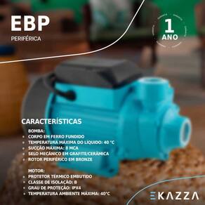 Motobomba Periférica EBP1000 1,0 HP Aquastrong Voltagem: 127V A motobomba periférica EBP é utilizada principalmente para abastecimento doméstico e pequenos prédios.Sistemas de pressurização de baixa pressão.Irrigação de pequeno porte.Apresenta um desempenho com baixo volume de água, porém com altas pressões. Características Técnicas:- Corpo em ferro fundido- Temperatura máxima do líquido: 40 C- Sucção máxima: 8 mca- Selo mecânico em Grafite/Cerâmica- Rotor periférico em bronze Características do motor:- Potência: 1,0HP- Protetor térmico embutido- Classe de isolação: B- Grau de proteção: IPX4- Temperatura ambiente máxima: 40C Diferenciais:- Grande versatilidade de usos- Baixo custo Modelo: EBP1000Cor: AzulGarantia: 12 meses Tensão: verifique a voltagem na hora da compra.- Modelo 127 VCA - Mono- Modelo 220 VCA - Mono