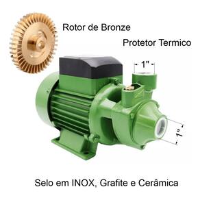 - Caracol de ferro fundido. - Rotor de bronze. - Selo mecânico constituído de aço inox AISI-304, buna N, grafite e cerâmica. - Bocal de sucção e recalque de 1” com rosca BSP. - Vazão de 0,2 a 1,6 m³/h. - Motor elétrico monofásico, com proteção IP-44, 2 polos, 60 Hz e com protetor térmico. - Tensão: 220 V.