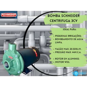 - Tipo: Centrífuga. - Potência: 3,0 CV. - Trifásico (220V/380V) Não e Bivolt. - Marca: Schneider. - Linha: motobomba sem intermediário. - Bocais com rosca BSP. - Sucção 1. 1/2 (Pol). - Recalque 1 (Pol). - Caracol da motobomba de ferro fundido GG-15. - Rotor fechado de alumínio. - Selo mecânico constituído de aço inox AISI-304, buna N, grafite e cerâmica. - Motor elétrico Weg IP-21 com flange incorporada, 2 Polos, 60 Hz.