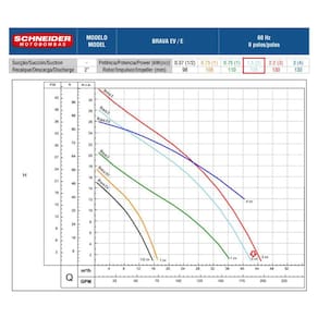 Especificações Técnicas: Modelo: Brava E20 Potência: 2CV Tensão: 380V Fase: Trifásica Diâmetro Recalque: 2 Polegada Diâmetro máximo dos sólidos: 25 mm Pressão máxima sem vazão: 29 mca Diâmetro Rotor: 125 mm Bocal roscado BSP Caracol da motobomba de ferro fundido cinzento GG-20 Rotor semiaberto Vórtex de Noryl 30% fibra de vidro para os modelos DV / EV até 1 cv Rotor semiaberto de ferro fundido GG-25 para os modelos D / E / EV40 Placa de fundo de ferro fundido GG-20 (modelos E/EV40) Selo mecânico duplo, constituído de aço inox AISI-304, buna N, grafite e cerâmica para os modelos D / E / EV40 Motor elétrico IP-68, 2 polos, 60Hz, refrigerado com óleo dielétrico, eixo de aço inox AISI-420 Motor monofásico com proteção térmica (modelos DV / E / EV) Comprimento do cabo de ligação: 7 m (modelos DV / EV) e 10 m (modelos D / E / EV40)