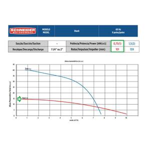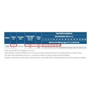 Especificações Técnicas: Modelo: Shark Tipo: Trituradora / Submersa Monoestágio Potência: 1 CV Tensão: 220 Volts Fase: Monofásica Diâmetro Recalque: Bocais com rosca BSP 1 1/4 e adaptador com rosca 2 Polegadas Diâmetro Rotor: 101 mm Pressão máxima sem vazão: 14,5 m.c.a. Rotor semiaberto Material do rotor: Ferro Fundido GG-25 Selo mecânico em Buna Eixo em aço inox 420 Triturador de aço inox temperado AISI 440 C, de alta dureza; Selo mecânico constituído de aço inox AISI-316, buna N, carbeto de silício (Modelos 1 cv) Motor elétrico IP-68, 2 polos, 60 Hz, refrigerado com óleo dielétrico, classe de isolamento F (155 Motor monofásico com proteção térmica Comprimento do cabo de ligação: 6 m (Modelos 1 cv)