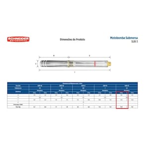 Especificações Técnicas: Modelo: SUB3-25 (3 Fios) Tipo: Submersível Fase: Monofásica Voltagem: 220V Potência: 1,5CV Estágios: 25 Diâmetro Recalque: 1 Polegada Pressão máxima sem vazão: 145 mca Rotor: 58 mm Rotor e Difusor em Tecnipolímero Injetado Acoplamento do motor de acordo com a Norma NEMA Bocal de recalque de 1 com rosca BSP Motor elétrico com proteção IP-68, 2 polos, 60 Hz
