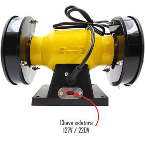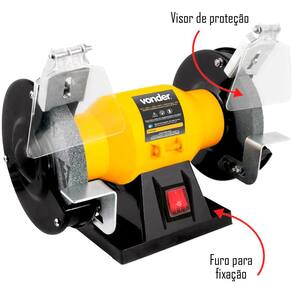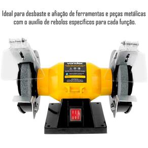 Equipamento bivolt. Conta com com visor de proteção e base de apoio para a peça a ser trabalhada. Ideal para desbaste e afiação de ferramentas e peças metálicas com o auxílio de rebolos específicos para cada função. Para algumas atividades é necessária a aquisição de acessórios que são vendidos separadamente como, por exemplo, escova circular de aço e roda de pano. Dimensões: 275 mm x 170 mm x 220 mm. Massa aproximada: 3,8 kg.