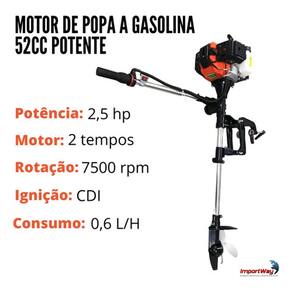 Especificações do produto: - Rotação: 7500 rpm - Potência: 2,5 hp - Cilindradas: 52CC - Motor 2 tempos monocilíndrico - Refrigerado a ar - Consumo: 0,6 L/H - Capacidade do tanque: 1,2 litros - Proporção de mistura de gasolina: 25:1 - Ignição CDI - Partida Manual