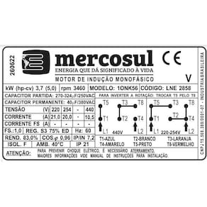 Motor da marca mercosul eberle. Primeira fábrica de motores elétricos, com alta qualidade, confiabilidade e eficiência no brasil. Motor com duplo capacitor, sendo um de partida e outro permanente, garantindo maior força e eficiência do motor. Algumas de suas aplicações mais utilizadas: Compressores Furadeiras de colunas Exaustores Bombas Moto-esmeris Máquinas em geral. Características gerais: Potência: 5cv; 2 pólos, alta rotação; Motores com dois capacitores; Grau de proteção: ip21; Carcaça: 56 nema mg1; Tensão: 220-254/440 v; Frequência: 60 hz; Classe de isolação: f 155 c ; Fabricante: mercosul motores; Tecnologia eberle. : 24 meses com direto com o vendedor. Marca: Não Informado