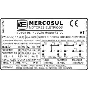 Motor da marca mercosul eberle. Primeira fábrica de motores elétricos, com alta qualidade, confiabilidade e eficiência no brasil. Este motor atende as mais variadas aplicações onde roda tanto em sentido horário como anti-horário. Acompanha polia de alumínio de 2 canais tipo a Algumas de suas aplicações mais utilizadas: Furadeiras de colunas; Bombas; Moto-esmeris; Moedor/ralador; Serra de bancada; Serra fita; Máquinas em geral. Características gerais: Potência: 2cv; 2 pólos - alta rotação - 3500rpm; Grau de proteção: conforme abnt nbr-6146; Freqência: 60hz; Grau de proteção: ip21; Carcaça: 56 nema mg1; Tensão: 110-127/220-254 v; Classe de isolação: f 155 c ; Fabricante: mercosul motores; Tecnologia eberle. : 24 meses com direto com o vendedor. Ean: 7793838633528
