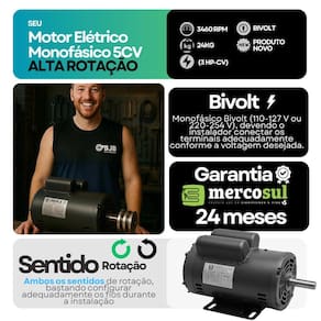 - Potência: 5Cv; - 2 Pólos, Alta rotação; - Motores com dois capacitores; - Grau de proteção: IP21; - Carcaça: 56 NEMA MG1; - Tensão: 220-254/440 V; - Frequência: 60 Hz; - Classe de isolação: F 155 C ; - Fabricante: Mercosul Motores; - Tecnologia Eberle. Marca: Não Informado Ean: 7898440224680
