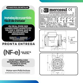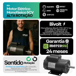 - Potência: 5Cv; - 2 Pólos, Alta rotação; - Motores com dois capacitores; - Grau de proteção: IP21; - Carcaça: 56 NEMA MG1; - Tensão: 220-254/440 V; - Frequência: 60 Hz; - Classe de isolação: F 155 C ; - Fabricante: Mercosul Motores; - Tecnologia Eberle. Marca: Não Informado