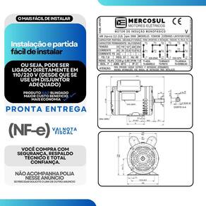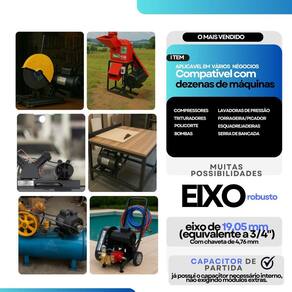 1. Esse motor é bivolt Como faço a ligação correta Sim, o motor é monofásico bivolt, operando em redes de 110-127V ou 220-254V. A ligação correta depende da tensão da rede e deve ser feita conforme o diagrama que acompanha o produto. 2. O motor já vem com polia e capacitor O motor acompanha o capacitor de partida. A polia não está inclusa na versão padrão e deve ser adquirida separadamente, salvo em kits específicos que já incluem a polia. 3. Qual o diâmetro do eixo e o tamanho da chaveta O eixo possui diâmetro de 19,05 mm 3/4 e a chaveta tem 4,76 mm 3/16 , medidas padrão para a maioria das aplicações industriais. 4. Esse motor é compatível com compressores de ar Sim, ele é ideal para compressores de até 15 pés/min e tanques entre 150 e 200 litros, incluindo modelos de 2 estágios. Oferece torque suficiente para aplicações industriais. 5. Pode ser em serras circulares ou policorte Sim, o motor é indicado para serras de bancada, esquadrejadeiras e máquinas de corte. Sua alta rotação e potência garantem desempenho estável para cortes em madeira ou metal. 6. Serve para bombas dágua, lavadoras ou forrageiras Sim, o motor pode ser em bombas hidráulicas, lavadoras , moto-esmeris, forrageiras e outros equipamentos agrícolas e industriais. 7. Qual é o sentido de rotação do motor O motor permite rotação horária e anti-horária. A inversão do sentido pode ser feita na instalação, conforme orientações do diagrama de ligação. 8. É necessário usar chave de partida Não. O motor é de partida direta e já acompanha o capacitor. Pode ser ligado diretamente à rede elétrica, com proteção adequada no disjuntor. grau de proteção: IP21; - Carcaça: 56 NEMA MG1; - Tensão: 110-127/220-254 V; - Frequência: 60 Hz; - Classe de isolação: F 155 C ; - Diâmetro do Eixo: 19,05mm ou 3/4 de polegada; - Tamanho da chaveta do eixo: 4,76mm ou 3/16 de polegada; - Fabricante: Mercosul Motores; -tecnologia Eberle. Marca: Não Informado Ean: 7898440225342