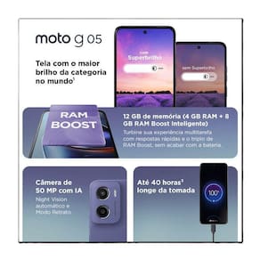 Atenção aos seguintes detalhes - Antes de utilizar o aparelho leia o manual de instruções. - Não submergir o cabo, plugue ou o aparelho em água. - O uso do produto diferente do descrito no manual de instruções acarreta na perca da . Celular Motorola G05 128GB de Memória 4GB Ram Violeta Tela 6.7'' Bateria 5200 mAh Conheça o Motorola Moto G05, o smartphone perfeito para quem precisa de uma bateria de longa duração, desempenho ágil e um design elegante. Com sua tela imersiva de 6,7 polegadas e armazenamento generoso, ele é a escolha certa para quem procura um aparelho que acompanha seu ritmo, seja no trabalho ou no lazer. Benefícios - Armazenamento Amplo de 128GB - Desempenho Ágil com 4GB de RAM + 8GB RAM Boost - Tela de 6,7 FHD+ 720 x 1612 - Câmera com IA e Night Vision Automático - Bateria de 5200mAh: Energia Que Dura o Dia Todo - Design Moderno - Segurança e Praticidade com Android 15 FICHA TÉCNICA : - Marca: Motorola - Modelo: G05 - Cor: Violeta - Memória RAM: 4 GB - Armazenamento Total: 128 GB - Tela de 6,7 FHD+ 1080 x 2400 IPS 90 Hz - Bateria: 5200 mAh - Desbloqueio Facial: Sim - Impressão Digital lateral: Sim - Peso: 188,8 g - Dimensões AxLxP :16,6 cm x 7,5 cm x 1 cm - Código Anatél: 08268-24-00330 Itens inclusos 01 Telefone 01 Manual 01 Cabo USB-A / USB-C 01 Carregador de parede 01 Ferramenta de remoção do chip pelo fabricante: 12 meses Não perca tempo limitado - Garanta o seu Moto G05 agora mesmo antes que acabe. Homologação Anatel: 166292013501 Marca: Não Informado