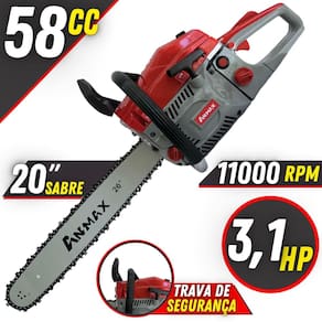 ESPECIFICAÇÕES TÉCNICAS: - Código: 89 - Modelo: CS5800A - Motor: 2 tempos - Potência: 3,1HP - Cilindrada: 58cc - Rotação Máxima: 11.000 RPM - Rotação na lenta: 3.000 RPM - Sabre: 20” (50cm) - Ignição: Eletrônica CDI - Arranque: Manual com mola retrátil - Amortecedores: Sim - Carburador: Diafragma - Elemento Simples - Combustível: Gasolina comum com Óleo 2T - Tanque do Combustível: 550ml - Tanque do Óleo: 260ml - Sistema de Lub. Da Corrente: Bomba Automática - Consumo: aproximadamente 0,9L por hora - Autonomia: Aproximadamente 40 min - Peso do produto: 7,8kg - Peso com embalagem: 9kg - Dimensões do Produto: 29 x 26 x 84 - Dimensões da Embalagem: [A x L x P] cm: 51 x 27 x 28