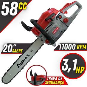 ESPECIFICAÇÕES TÉCNICAS: - Código: 89 - Modelo: CS5800A - Motor: 2 tempos - Potência: 3,1HP - Cilindrada: 58cc - Rotação Máxima: 11.000 RPM - Rotação na lenta: 3.000 RPM - Sabre: 20” (50cm) - Ignição: Eletrônica CDI - Arranque: Manual com mola retrátil - Amortecedores: Sim - Carburador: Diafragma - Elemento Simples - Combustível: Gasolina comum com Óleo 2T – Proporção 25:1 - Tanque do Combustível: 550ml - Tanque do Óleo: 260ml - Sistema de Lub. Da Corrente: Bomba Automática - Consumo: aproximadamente 0,9L por hora - Autonomia: Aproximadamente 40 min - Peso do produto: 7,8kg - Peso com embalagem: 9kg - Dimensões do Produto: 29 x 26 x 84 - Dimensões da Embalagem: [A x L x P] cm: 51 x 27 x 28