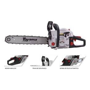 Motosserra Toyama TCS58H, equipada com motor de 54,4 cc e sabre de 18 polegadas de ponta rolante. Foram desenvolvidas e fabricadas especialmente para o usuário que busca qualidade de equipamento com baixo custo de aquisição. Para torná-la leve, durável e confiável utilizamos em sua produção, liga de alta resistência. Indicada para usuários que buscam atender suas necessidades de serviços leves e médios na poda e corte de árvores.