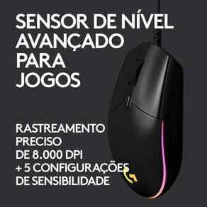 Características: Linha: G203 LIGHTSYNC Sensor com até 8.000 DPI ajustáveis Iluminação RGB LIGHTSYNC com até 16,8 milhões de cores Efeitos e padrões personalizáveis Design clássico de 6 botões programáveis Sistema de tensionamento de botões por mola de metal Conforto e durabilidade para longas sessões de uso