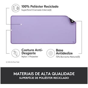 Mousepad Logitech Desk Mat Studio XL Lilás 956-000036-V Especificações Técnicas Produto Mousepad Logitech Desk Mat Studio XL Lilás Fabricante Logitech PN 956-000036-V EAN 097855169426 Materias Antiderrapante: Sim Dimensoes: C: 31cmL: 6,6 cmA: 6,6 cm Cor: Roxo Material: Emborrachada Antideslizante Meta Title: Mousepad Logitech Desk Mat Studio XL Lilás - 956-000036-V Meta Description: O Mouse Pad Desk Mat Studio Series XL da Logitech é produzido em materiais cuidadosamente selecionados, que impedem-o de encolher e enrugar e seu desenho com costuras planas protege as bordas contra desgastes. Além disso, sua base é antiderrapente e apres Altura Sem Embalagem: 0 Comprimento Sem Embalagem: 0 Largura Sem Embalagem: 0 Peso Bruto Sem Embalagem: 0,00 Peso Liquido Sem Embalagem: 0,00