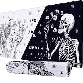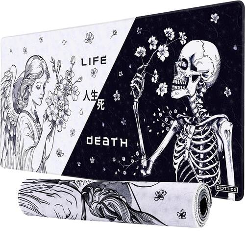 Material: borracha Tamanho: 300* 600* 2 mm Peso: 500 g Tamanho estendido para jogos: medindo 600 x 300 x 2 mm, este grande mouse pad oferece amplo espaço para teclado e mouse, perfeito para jogos, trabalho de escritório ou uso criativo. Design artístico de vida e morte: apresenta um design ousado de contraste em preto e branco com obras de arte simbólicas de anjos e esqueletos, adicionando um toque artístico único à sua mesa. Superfície lisa à prova d'água: o tecido de textura fina garante um controle preciso do mouse, enquanto o revestimento à prova d'água protege contra derramamentos e manchas. Base de borracha antiderrapante: feita com borracha natural durável que segura a mesa com firmeza, evitando movimentos indesejados durante sessões intensas de jogo. Durável e fácil de limpar: bordas grossas costuradas evitam o desgaste e o material flexível se enrola facilmente para transporte ou armazenamento.