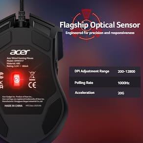 Domine o jogo, simplifique seu fluxo de trabalho e personalize cada clique com o mouse para jogos Acer com fio. Construído para jogadores competitivos e usuários avançados, este mouse oferece precisão, desempenho e personalização em um pacote ergonômico. Com DPI habilitado por software de até 12.800, você pode alternar instantaneamente entre 4 níveis predefinidos para corresponder a qualquer tarefa — desde tiros de atirador a navegação suave ou movimentos extremamente rápidos em telas de alta resolução. Oito botões programáveis dão a você a flexibilidade para remapear funções, atribuir macros complexas ou criar seus próprios atalhos para trabalho ou lazer. Ilumine sua mesa com 12 modos de iluminação RGB dinâmicos, incluindo ondulação, fluxo de neon e cometa. Sincronize efeitos com sua música ou ajuste-os através de software para combinar com sua configuração. Construído para resistência e velocidade, este mouse possui uma taxa de pesquisa de 1000 Hz, aceleração de 20 G e rastreamento de 7000 FPS. A memória integrada armazena todas as suas configurações personalizadas, para que você esteja sempre pronto, não importa o PC. Conecte e use com compatibilidade universal USB-A em Windows, Mac OS e Linux. Se você está esmagando seus inimigos, editando vídeos ou voando por planilhas, o mouse para jogos Acer é sua melhor ferramenta para precisão e potência.