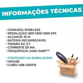 - conexão: wireless - resolução: 800 - 1300 - 1600 dpi - tipo de bateria: recarregável - tensão dc 3,7 - corrente 20ma - frequência: 2400-2480mhz