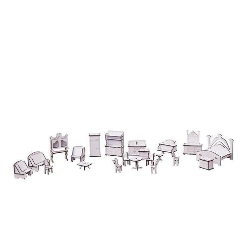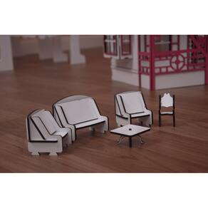 Confeccionado em mdf de 3 mm, o kit de móveis é composto pordiversas peças, as quais se encaixam sutilmente devido a precisão de corte dosmesmos. Não acompanha casinha.