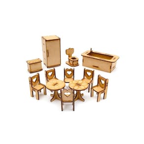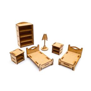 Confeccionado em mdf de 3 mm, o kit de móveis é composto por diversas peças, as quais se encaixam sutilmente devido a precisão de corte dos mesmos. Não acompanha casinha.