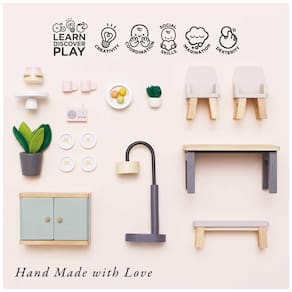 Este conjunto de móveis para casa de bonecas é da série Rosebud, que se destaca pelos detalhes realistas e cores suaves. As peças são feitas de madeira e algumas possuem acabamento em tecido. Além disso, as gavetas e armários são funcionais e há pequenos acessórios que dão vida ao ambiente. Na sala de estar, há um piano rosa e um relógio de pêndulo azul, além de um conjunto de jantar com cadeiras recortadas em forma de coração. O China Cupboard inclui pratos e sobremesas. Este conjunto de 24 peças é pintado à mão e projetado intuitivamente pela Le Toy Van. Ele incentiva a imaginação criativa e proporciona horas de diversão. É colorido, educacional e ambientalmente amigo, e inclui todos os acessórios ilustrados. É um ótimo complemento para qualquer casa de bonecas e inspira brincadeira interativa e desenvolvimento social. As bonecas são vendidas separadamente. Adequado para crianças a partir de 3 anos.