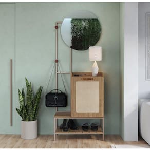 O Móvel Benvindo - Olmo/Champagne conta com um toque de modernidade e sutileza. Confeccionado com materiais de qualidade, garantindo sempre uma maior durabilidade da peça. Possui seu tampo em MDP BP 15mm, pés em aço carbono 15x15mm com pintura epóxi na cor Champagne. O espelho tem seu tampo colado em MDF 15mm, na medida de 60x60cm e acabamento em PU na cor caramelo envelhecido. Possui também 2 cabideiros em madeira, puxador em PU e sapatas para evitar danos no chão.