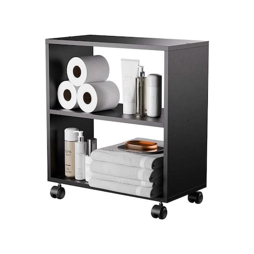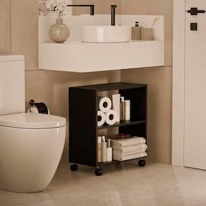 O Móvel Organizador Multiuso para Banheiro com Rodinhas Preto é a solução ideal para otimizar o espaço e a organização em seu banheiro!