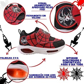 Com o Tênis Mini-pé Infantil de Led Aranha, toda criança está pronta para a brincar e divertir. O tênis possui luzes de LED que acendem a cada passo da criança, iluminando por onde passar! Este modelo foi desenvolvido para conforto das crianças com calce fácil garante a diversão de todos que calçar. Produzido com material têxtil e detalhes em sintético de extrema qualidade, garantindo assim, além de um design exclusivo, muito estilo, conforto e resistência para os pequenos.