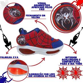 Com o Tênis Mini-pé Infantil de Led Aranha, toda criança está pronta para a brincar e divertir. O tênis possui luzes de LED que acendem a cada passo da criança, iluminando por onde passar! Este modelo foi desenvolvido para conforto das crianças com calce fácil garante a diversão de todos que calçar. Produzido com material têxtil e detalhes em sintético de extrema qualidade, garantindo assim, além de um design exclusivo, muito estilo, conforto e resistência para os pequenos.