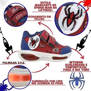 Com o Tênis Mini-pé Infantil de Led Aranha toda criança está pronta para a brincar e divertir. O tênis possui luzes de LED que acendem a cada passo da criança, iluminando por onde passar! Este modelo foi desenvolvido para conforto das crianças com calce fácil garante a diversão de todos que calçar. Produzido com material têxtil e detalhes em sintético de extrema qualidade, garantindo assim, além de um design exclusivo, muito estilo, conforto e resistência para os pequenos.