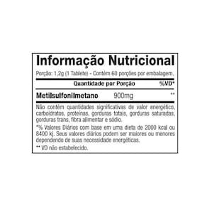 MSM 60 tabs MSM 60 tabs O MSM Methyl Sulfonyl Methane é um suplemento avançado que promove a saúde das articulações, da pele, dos cabelos e das unhas. Cada tablete oferece uma dose eficaz de 900 mg de Metilsulfonilmetano, uma forma natural de enxofre orgânico essencial para diversas funções do organismo. benefícios: - Saúde articular: Reduz inflamações, alivia dores e melhora a flexibilidade das articulações, ideal para quem pratica atividades físicas ou sofre com desconfortos articulares.- Pele mais jovem e saudável: Contribui para a redução de rugas e linhas de expressão, graças às suas propriedades de suporte à regeneração celular.- Fortalecimento de cabelos e unhas: Auxilia no crescimento e fortalecimento, proporcionando maior resistência e brilho.- Efeito : Atua na redução de processos inflamatórios em todo o corpo, favorecendo o bem-estar geral. Marca: Não Informado