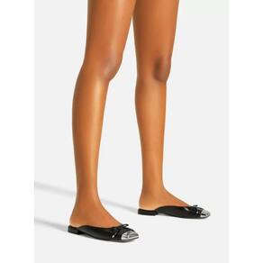 Descrição: Mule preta em couro. O sapato tem salto rasteiro, ponta quadrada e biqueira metalizada. Traz cabedal com recorte arredondado e aplicação de laço pequeno. Aberta atrás, exibe toda parte superior e traseira do pé. Referência: A1292900180001