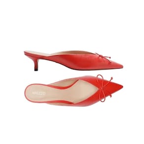 Descrição: Mule vermelha de couro. O sapato tem salto baixo fino e ponta fina. Traz cabedal fechado, com recorte em V e aplicação de laço pequeno. Com palmilha bege e inscrição do nome da marca. Exibe a parte superior do pé e o calcanhar. Referência: A1345600010001