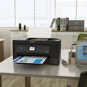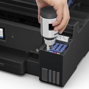 A nova multifuncional wireless EcoTank L14150 4-em-1 imprime 100% sem cartuchos e é compatível com formatos até A3+. Suas garrafas de tinta são projetadas para evitar desperdício; e codificadas para você abastecer os tanques de forma fácil. Permite imprimir até 7.500 páginas em preto ou 6.000 páginas coloridas. Imprima centenas de projetos sem interrupções com o kit de garrafas de tinta original Epson - que equivale a 35 kits de cartucho de tinta. Dessa forma, você economiza até 90% em tinta com as garrafas de reposição de baixo custo8. Além disso, é possível imprimir sem a necessidade de usar um computador, graças ao visor LCD touch colorido de 2,7".