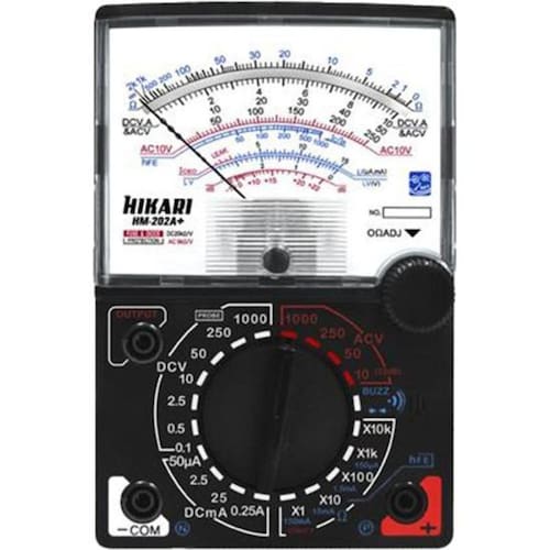 O Multímetro Analógico Hikari HM-202A é uma ferramenta essencial para qualquer técnico em eletrônica ou eletricista. Com resposta rápida, este modelo se torna ideal para medições em bancadas de circuitos eletrônicos e ambientes monofásicos protegidos, como tomadas e interruptores. Amplamente reconhecido, destaca-se pelo teste de Iceo de Transistores e realiza medições de Tensão DC/AC, Corrente DC, Resistência, além de testes de Continuidade, Diodo, LED e Decibel.