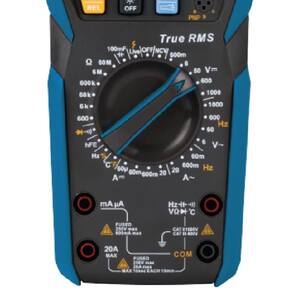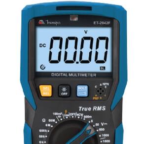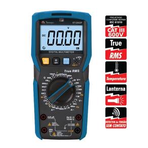 Equipado com display de 6000 contagens com iluminação de fundo (backlight). Faz medidas de tensão DC / (AC RMS), corrente DC / (AC RMS), resistência, capacitância, frequência de rede, testes de diodo, temperatura, continuidade e hFE de transistor.