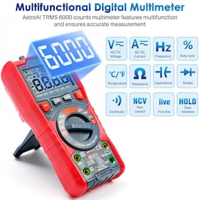 AstroAI Multímetro digital, TRMS 6000 contagens testador de tensão de variação automática voltímetro medindo corrente de tensão CA/CC, resistência de capacitância, frequência, temperatura, - AMPLAS APLICAÇÕES: Este multímetro digital AstroAI possui variação automática de 6000 contagens para medição precisa de tensão CA/CC, corrente, resistência, continuidade, capacitância, frequência, diodos e temperatura. Este multímetro é uma ferramenta realmente útil para testes de eletricistas, uso doméstico, problemas elétricos automotivos e industriais - JACK INTELIGENTE DE LED: Ligue o mostrador e as luzes LED e os conectores brilharão de acordo. Mude o mostrador para escolher a função que você precisa, a luz LED correspondente pisca para dizer qual conector você deve escolher. Um grande visor de retroiluminação LCD e lanterna na parte traseira garantem fácil uso em locais mal iluminados. Suporte estável, compartimento para caneta na parte traseira. - Multifuncional: possui funções inteligentes, prompt de bateria fraca, retenção de dados, dados máximo/mínimos, desligamento automático, alcance automático, luz de fundo e lanterna. A tela LCD muda para vermelho enquanto detecta fios ativos e a luz de fundo fica laranja ao medir a alta tensão. - Segurança sem contato: este DMM foi projetado com segurança em mente. Possui teste de tensão sem contato e função ao vivo com alarme de som e luz, funciona para tomadas, tomadas, terminais e muito mais com segurança. - DICAS ADICIONAIS: O multímetro passou pelos padrões de segurança de categoria III 600V e CE de sobretensão. Antiqueima com um fusível duplo de cerâmica e circuito de proteção de termistor; os fusíveis podem proteger o multímetro de forma eficaz; há proteção contra sobrecarga em todos os intervalos. A capa protetora de silicone evita danos à máquina.