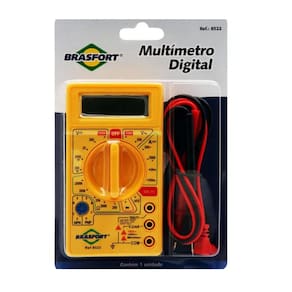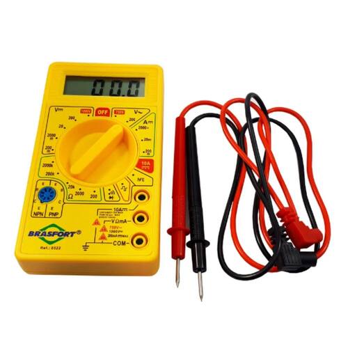 Medição de corrente, tensão alternada e contínua, resistência elétrica, polarização de transistor e teste de continuidade. Carcaça em PVC na cor amarela, visor de cristal líquido, lente de acrílico e placa integrada de circuito impresso com diversos componentes.