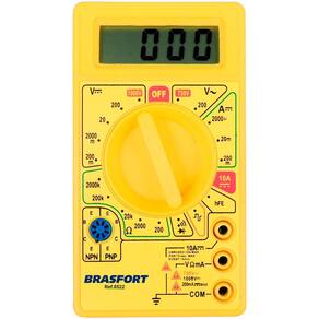Possui teste transistor, Diodo e indicador de bateria fraca; Dimensão do display 16 x 48 mm Display: 4 dígitos Precisão básica: 2% +/- 10 Tensão AC: 200V/750V Tensão DC: 200mV/2V/20V/200V/1000V Corrente DC: 200µA/2000uA/20mA/200mA/10A Corrente AC: 200µA/2000µA/20mA/200mA/10A Resistência: 0,2k/2k/20k/200k/2M Ohms Capacitância: Não possui Frequência: Não possui Duty Cycle: Não possui Teste Continuidade: Não possui Auto Desligamento: Não possui Mudança de Faixa: Não possui Precisão Básica: 2% +10 Categoria: Residencial/Hobby Dimensões: 100 x 130 x 30mm Ilumi/Barra Graf.: Não Temperatura: Não possui Garantia: 12 meses