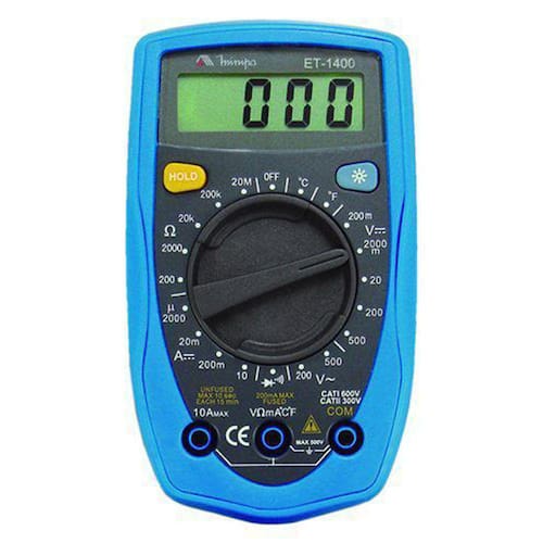 Multímetro digital profissional et1400 original minipa Instrumento digital portátil, que se acomoda na palma da mão, de acordo com a categoria ii 300v de segurança, congelamento da leitura, mudança de faixa manual, holster protetor e lcd de 3 1/2 dígitos, com iluminação de fundo. Realiza medidas de tensão dc e ac, corrente dc, resistência e temperatura, e testes de diodo e continuidade. Display: 3 1/2 dígitos, 2000 contagens e iluminação de fundo. Velocidade de medida: atualização de 2~3 vezes/seg. Indicação de polaridade: automática, negativa indicada " ". Indicação de sobrefaixa: "1" é mostrado. Indicação de bateria fraca: indicação "símbolo de bateria" será mostrada. Mudança de faixa: manual. Data hold. Temperatura de operação: 0°c a 40°c 32°f a 104°f . Temperatura de armazenamento: 10°c a 50°c 14°f a 122°f . Umidade relativa: 75% à 0°c~30°c, 50% à 31°c~40°c. Altitude de operação: 2000m. Altitude de armazenamento: 10000m. Ambiente para especificação de precisão: 23°c ± 5°c, rh 75%. Coeficiente de temperatura: 0,1 x precisão especificada / 1°c. Alimentação: uma bateria 9v neda 1604 ou 6f22 ou 006p . Conformidade: iec1010 sobretensão cat i 600v, cat ii 300v e dupla isolação. Certificação: ce Dimensões: 130 a x 73.5 l x 35 p mm.Especificações: Tensão dc Faixas: 200mv, 2000mv, 20v, 200v, 500 v Precisão: 200mv ~ 200v ± 0.5%+2d ; 500v ± 0.8%+2d Resolução: 0.1mv, 1mv, 10mv, 100mv, 1v Impedância de entrada: 10 mohms Proteção de sobrecarga: 200mv: 250v dc / ac; outras: 500v dc / ac Tensão ac Faixas: 200v, 500v Precisão: ± 1.2%+10d Resolução: 100mv, 1v Impedância de entrada: 5 mohms Resposta em frequência: 40hz a 400hz Mostra o valor eficaz de um sinal senoidal resposta do valor médio Proteção de sobrecarga: 500v dc / ac Corrente dc Faixas: 2000µa, 20ma, 200ma, 10ª Precisão: 2000µa ~ 20ma ± 1.0%+2d ; 200ma ± 1.2%+2d ; 10a ± 2.0%+5d Resolução: 1µa, 10µa, 100µa, 10ma Proteção de sobrecarga: fusível de ação rápida 0.3a/250v para a entrada µa e ma. A faixa 10a não possui fusível. Faixa de 10a medida contínua 10seg e intervalo não menor que 15min. Resistência Faixas: 200, 2000, 20k, 200k, 20 mohms Precisão: 200 ohms ± 0.8%+5d ; 2000 ~ 200 kohms ± 0.8%+2d ; 20 mohms ± 1.0%+5d Resolução: 0,1, 1, 10, 100, 10 kohms Proteção de sobrecarga: 250v dc / ac Temperatura Faixas: 40°c ~ 1000°c, 40°f ~ 1832°f Precisão: 40°c ~ 150°c ± 1.0%+3d ; 150°c ~ 1000°c ± 1.5%+15d ; 40ºf ~ 302ºf ± 1.0%+4d ; 302ºf ~ 1832ºf ± 1.5%+15d Resolução: 1°c, 1°f Tipo de sensor: termopar tipo k Proteção de sobrecarga: 250v dc / ac Diodo Faixa: diodo Descrição: display mostra a queda de tensão direta aproximada de 0.5v ~ 0.8v Resolução: 1mv Proteção de sobrecarga: 250v dc / ac Continuidade Faixa: buzina Descrição: a buzina toca se a resistência for menor que aprox. 70 ohms Resolução: 1 ohms Proteção de sobrecarga: 250v dc / ac Acessórios Manual de instruções Pontas de prova Holster protetor Ponta termopar Bateria