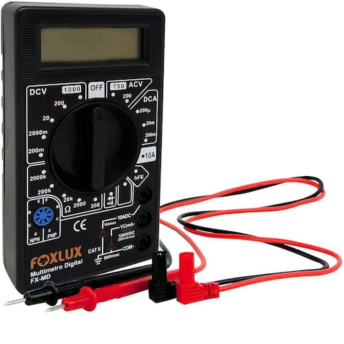 O Multímetro Digital Foxlux mede tensão contínua e alternada, corrente contínua, resistência, transistores e diodos. Apresenta como características a alta confiabilidade, durabilidade e simplicidade de operação.