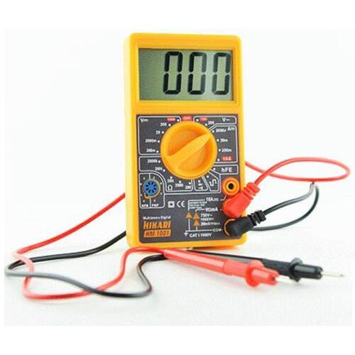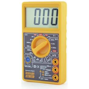 Multímetro Digital Hikari Hm1001O Multímetro Digital HM1001 se destaca pelas medidas de Tensão DC/AC, Corrente DC, Resistência e pelos testes de Diodo e Continuidade. Como característica adicional apresenta as funções: Gerador de Onda Quadrada, Teste de hFE e Indicador de Bateria Fraca.Contagem Máxima do Display: 2000 contagens 3.1/2 Dígitos.Indicação de Sobrefaixa: 1 é mostrado no display.Indicação de bateria fraca: é mostrado no display.Taxa de Amostragem: aproximadamente 2 vezes por segundo.Ambiente de Operação: 0C a 40C, RH menor80%.Ambiente de Armazenamento: 10C a 60C, RH menor70%.Tipo de Bateria: 1 x 9V NEDA1604 ou 6F22 ou 006P.Segurança / Conformidade: IEC1010 Sobretensão e Dupla Isolação, CAT I 1000V.Proteção por Fusível de 500mA/250V para o Terminal de Entrada mA.Dimensões: 124A x 68L x 24Pmm.Peso: Aproximadamente 110g incluindo bateria.Garantia: 6 meses.Modelo: HM1001Cód. UCB: 21N240 Ean: 7899810413888