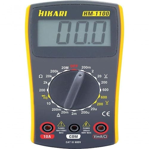 Multímetro Digital Hm-1100 Instrumento digital portátil, que se acomoda na palma da mão, de acordo com a categoria III 600V de segurança, mudança de faixa manual, LCD de 3 1/2 dígitos. Realiza medidas de tensão DC e AC, corrente DC , resistência e testes de diodo e continuidade. Display LCD / Contagens: 3 Dígitos / 2000 contagens Tensão DC: 200m/2/20/200/600V Tensão AC: 200/600V Corrente DC: 20/200/2m/20m/200m/10A Resistência: 200/2k/20k/200k/20MO Teste de Continuidade / Diodo: SIM Mudança de faixa: Manual Indicação de Bateria Fraca: SIM Precisão básica 0,5% Categora: CAT III 600V Dimensões: 145 x 85 x 30mm Peso: 170g Alimentação: Bateria 9V Instrumento digital portátil, que se acomoda na palma da mão, de acordo com a categoria III 600V de segurança, mudança de faixa manual, LCD de 3 1/2 dígitos. Realiza medidas de tensão DC e AC, corrente DC , resistência e testes de diodo e continuidade. Display LCD / Contagens: 3 Dígitos / 2000 contagens Tensão DC: 200m/2/20/200/600V Tensão AC: 200/600V Corrente DC: 20/200/2m/20m/200m/10A Resistência: 200/2k/20k/200k/20MO Teste de Continuidade / Diodo: SIM Mudança de faixa: Manual Indicação de Bateria Fraca: SIM Precisão básica 0,5% Categora: CAT III 600V Dimensões: 145 x 85 x 30mm Peso: 170g Alimentação: Bateria 9V