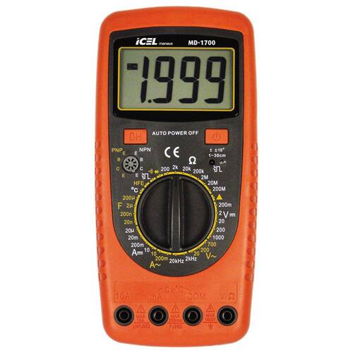 TENSãO CONTiNUA: 1000Vdc TENSãO ALTERNADA: 700VAC AUTO POWER OFF CORRENTE CONTiNUA: 10A RESISTÊNCIA: 200Mohms CAPACITÂNCIA: 200uF FREQUÊNCIA: 20KHz TEMPERATURA: -20° ~1000ºC DISPLAY (LCD), 3 ½ DiGITOS TRANSISTORES: HFE 0~1000 CONTINUIDADE DIODOS TESTE DE CONTROLE REMOTO: INFRAVERMELHO TESTE DE LINHA VIVA ALIMENTAçãO: UMA BATERIA DE 9V. INDICAçãO DE BATERIA FRACA DIMENSõES: 92X192X39 MM