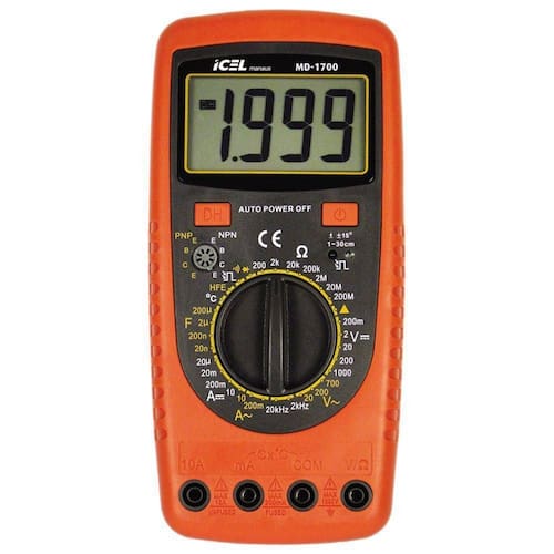 O MD-1700 é um multímetro digital de 3 ½ dígitos 2.000 contagens que incorpora características extras como: Teste de linha viva, Temperatura, Frequência, Capacitância e detecção de infravermelho. Foi desenvolvido com o que existe de mais moderno em tecnologia de semicondutores. Apresenta como características: alta confiabilidade, durabilidade e simplicidade de operação. Informações do produto TENSÃO CONTÍNUA: 1000Vdc TENSÃO Alternada: 700VAC Auto Power Off Corrente CONTÍNUA: 10A RESISTÊNCIA: 200Mohms CAPACITÂNCIA: 200uF FREQUÊNCIA: 20KHz Temperatura: -20° ~1000ºC Display Lcd , 3 ½ DÍGITOS Transistores: Hfe 0~1000 Continuidade Diodos Teste De Controle Remoto: Infravermelho Teste De Linha Viva Alimentação: Uma Bateria De 9V. Indicação De Bateria Fraca DIMENSÕES: 92X192X39 Mm Imagem meramente ilustrativa. Comercializado por: SKILL-TEC comércio e manutenção de instrumentos de Medição Ltda Ean: 2990714017532