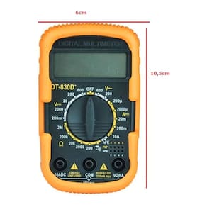 Visor LCD Tensão AC Tensão DC Corrente Resistência Teste de transistor Teste de diodos Teste de continuidade com sinal sonoro Alimentação: 01 bateria de 9V Mede tensão DC e AC, corrente DC e AC, resistência, hFE de transistor, diodo e continuidade.